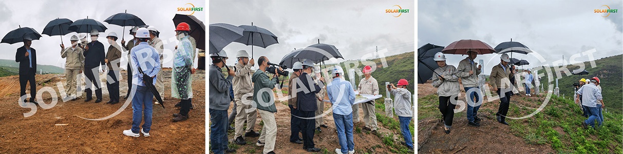 Am 14. Juni 2022 besuchte eine Delegation von Führungskräften der China Hydropower Ninth Engineering Bureau Co., Ltd. und der Yunnan-Niederlassung der China Datang Corporation die Baustelle des 60-MW-Photovoltaikkraftwerksprojekts in der Präfektur Dali in der Provinz Yunnan. Zhang Shaofeng, der stellvertretende Geschäftsführer der Solar First Group, begleitete die Inspektion.