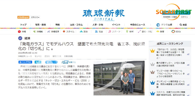 • Laut Ryukyu Shinpo in Japan betrachtet die Ryukyu Carbon Dioxide Reduction Promotion Association die Solarglasprodukte von Solar First als das „Ass“ zur Förderung von „Nullenergiegebäuden“.