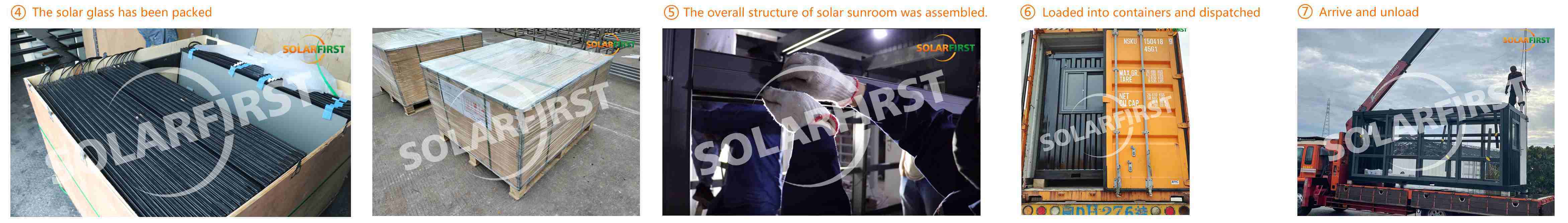 • 26. Mai 2022: Solarglas wurde in Verpackung fertiggestellt. Die Hauptstruktur des Wintergartens wurde • zusammengebaut. In Container verladen und versandt