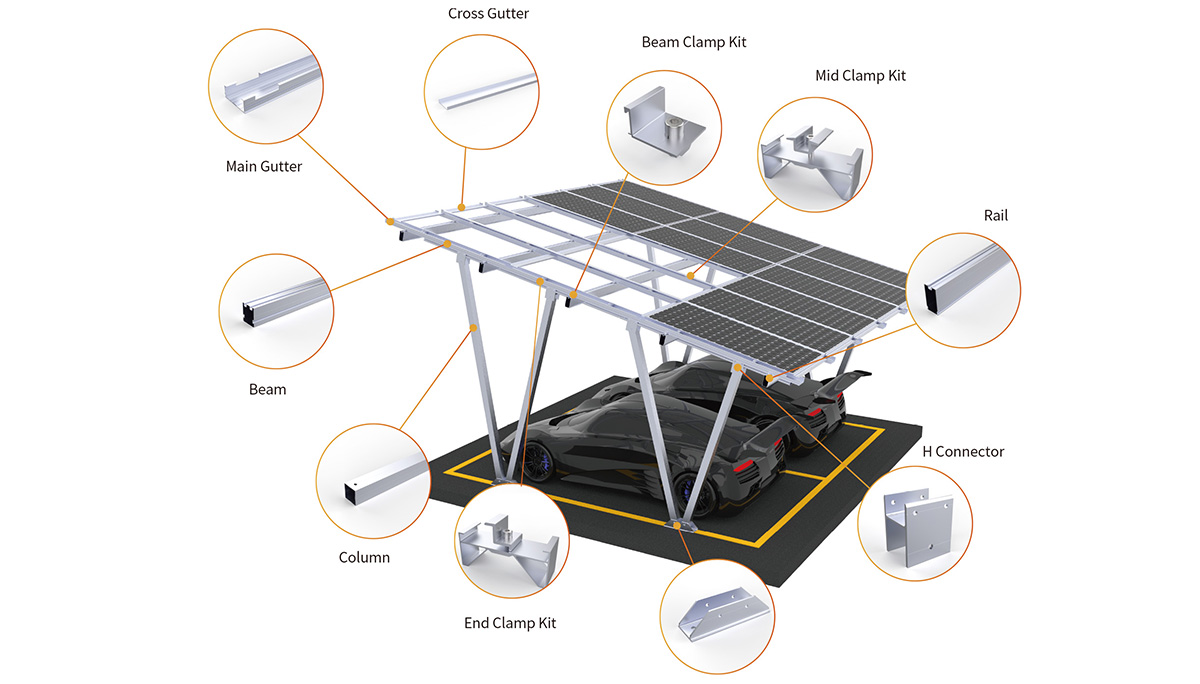 Die aus eloxiertem Aluminium AL6005-T5 und Edelstahl SUS304 gefertigte Solarcarport-Struktur ist leicht, hochkorrosionsbeständig und hält Windlasten von bis zu 60 m/s sowie Schneelasten von 1,4 kN/m² stand. Erhältlich in verschiedenen Ausführungen, darunter Schmetterlings-, Satteldach- und Pultdach (W-Typ & N-Typ), bietet sie Flexibilität bei der Gestaltung von Solarcarports für verschiedene Standorte und optische Vorlieben.