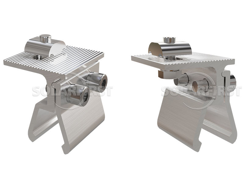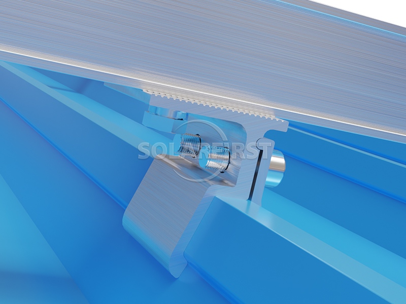 Das System nutzt eloxierte Aluminiumklemmen und -schienen, die die darunterliegende Dachkonstruktion leicht belasten. Das spezifische Design der Klip-Lok-Klemmen variiert je nach Profil der Dachbahnen. Für zusätzliche Flexibilität kann die Dachklemme mit einer L-Fußhalterung kombiniert werden, um die Solarmodule in den gewünschten Neigungswinkel zu bringen.