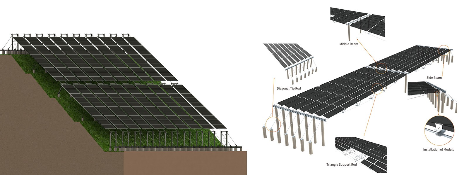 Das doppellagige flexible Kabelstützsystem erreicht durch eine räumliche Kabelnetzstruktur eine revolutionäre Spannweite von ≤ 50 Metern und schafft so einen Betriebsabstand von ≤ 6 Metern. Im Vergleich zu festen Stützen reduziert es den Bedarf an Pfahlgründungen um 55 % und eignet sich perfekt für Szenarien wie Kläranlagen, landwirtschaftliche Photovoltaik-Komplementarität und Fischerei-Photovoltaik-Komplementarität und entspricht dem GB50017-2017 Steel Structure Design Code.