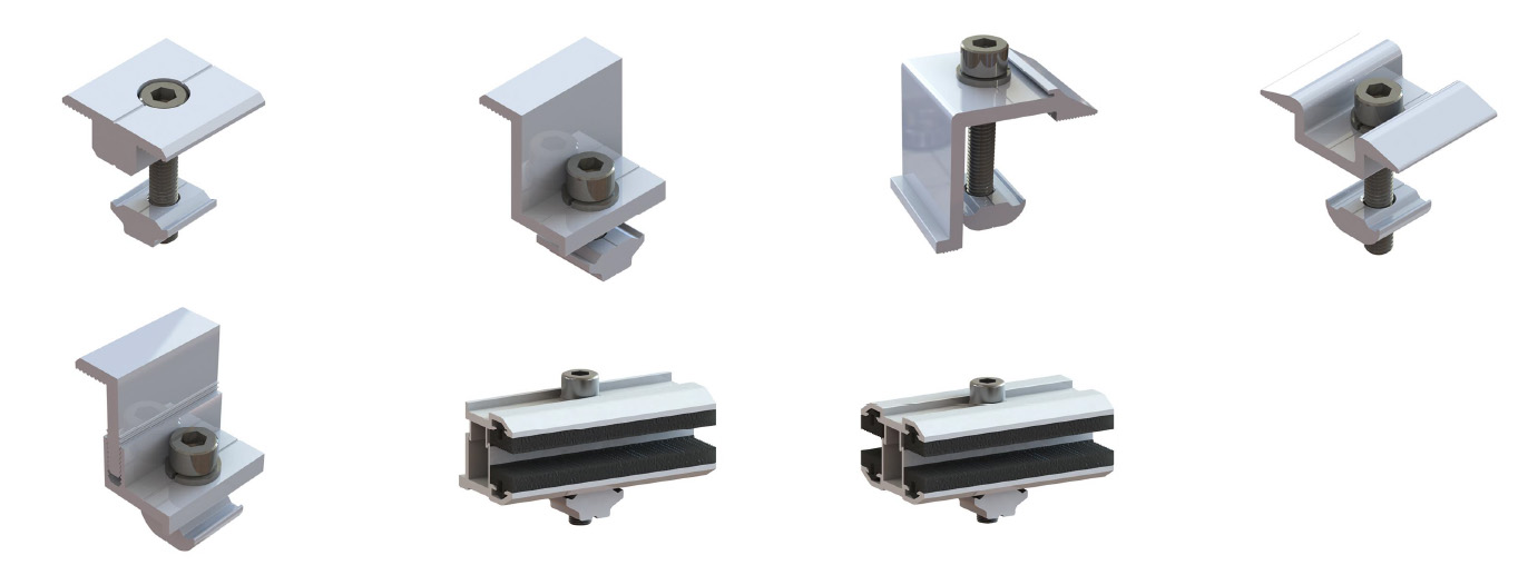 Die Klemmen sind in verschiedenen Ausführungen erhältlich, darunter mit Einzel- oder Doppelbolzenbefestigung, was die Installation vereinfacht und Zeit spart. Sie sind sowohl für Längs- als auch für Querplatten geeignet, passen sich verschiedenen Metalldachprofilen wie Einzel- oder Doppelfalzfalzen an und sind mit den meisten Solarmodulen kompatibel. Zusätzliche Komponenten wie L-Füße, Festfüße oder Modulklemmen ermöglichen eine flexible und schnelle Integration in komplette Schienensysteme.